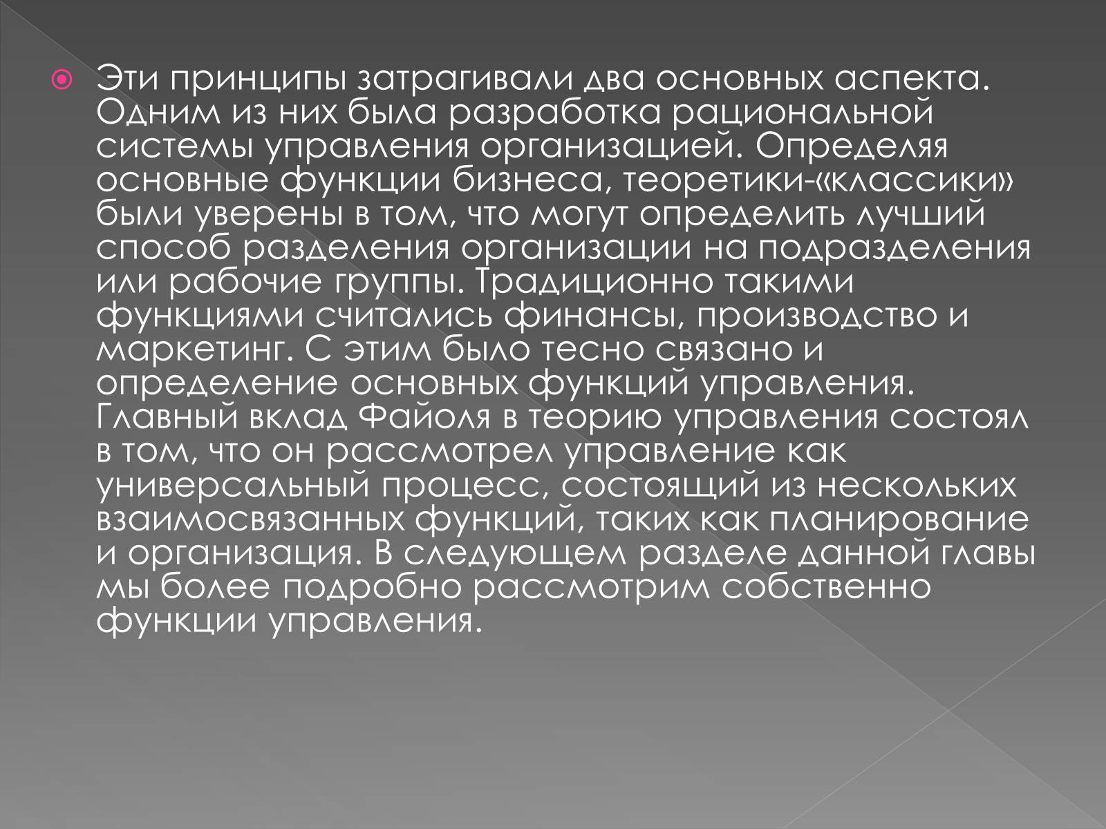 Эти принципы затрагивали два основных аспекта. Одним из них была разработка рациональной системы управления организацией. Определяя основные функции бизнеса, теоретики-«классики» были уверены в том, что могут определить лучший способ разделения организации на подразделения или рабочие группы. Традиционно такими функциями считались финансы, производство и маркетинг. С этим было тесно связано и определение основных функций управления. Главный вклад Файоля в теорию управления состоял в том, что он рассмотрел управление как универсальный процесс, состоящий из нескольких взаимосвязанных функций, таких как планирование и организация. В следующем разделе данной главы мы более подробно рассмотрим собственно функции управления.