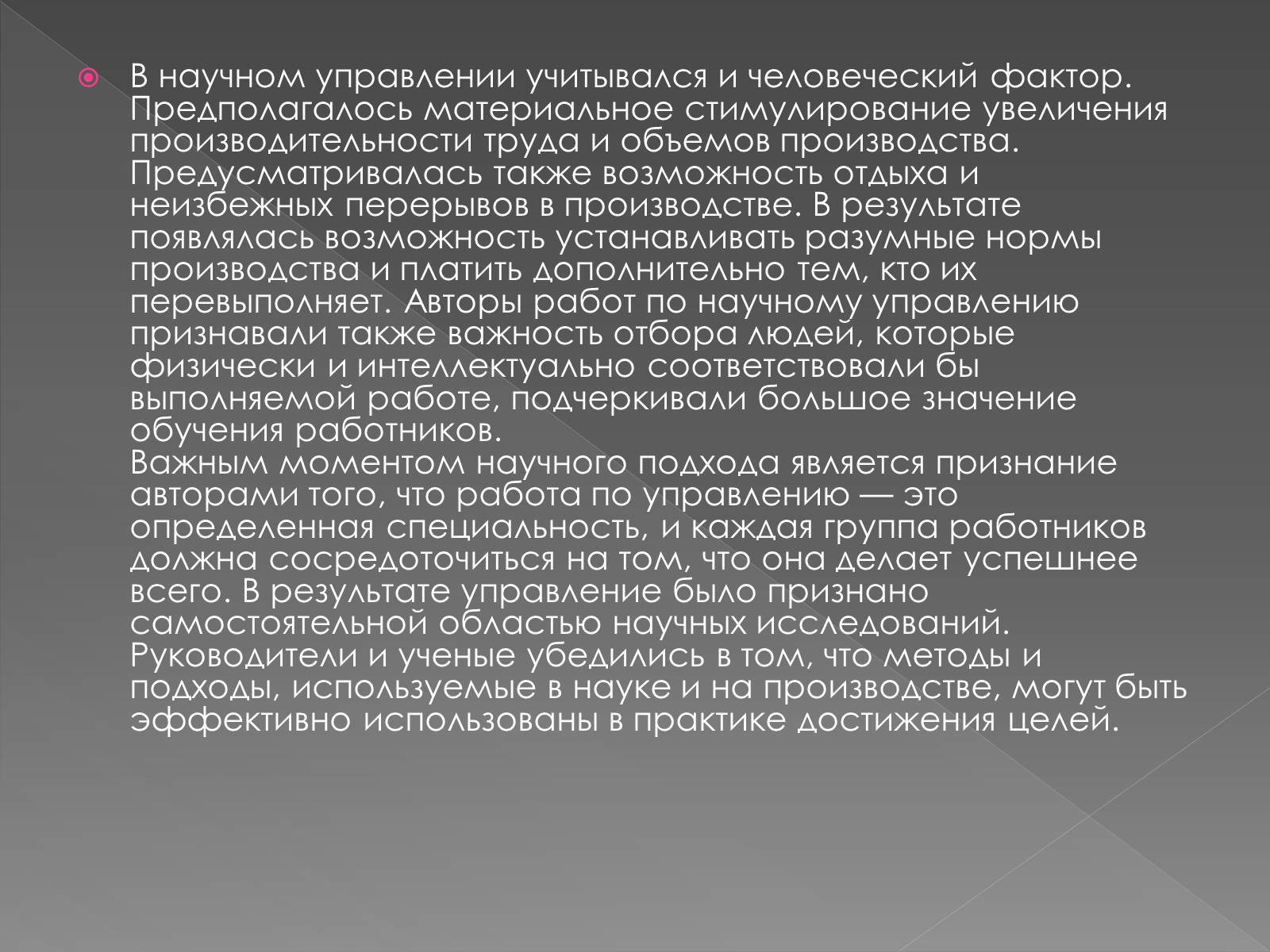 В научном управлении учитывался и человеческий фактор. Предполагалось материальное стимулирование увеличения производительности труда и объемов производства. Предусматривалась также возможность отдыха и неизбежных перерывов в производстве. В результате появлялась возможность устанавливать разумные нормы производства и платить дополнительно тем, кто их перевыполняет. Авторы работ по научному управлению признавали также важность отбора людей, которые физически и интеллектуально соответствовали бы выполняемой работе, подчеркивали большое значение обучения работников.Важным моментом научного подхода является признание авторами того, что работа по управлению - это определенная специальность, и каждая группа работников должна сосредоточиться на том, что она делает успешнее всего. В результате управление было признано самостоятельной областью научных исследований. Руководители и ученые убедились в том, что методы и подходы, используемые в науке и на производстве, могут быть эффективно использованы в практике достижения целей.