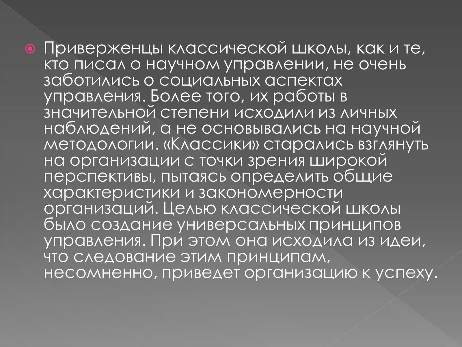 Приверженцы классической школы, как и те, кто писал о научном управлении, не очень заботились о социальных аспектах управления. Более того, их работы в значительной степени исходили из личных наблюдений, а не основывались на научной методологии. «Классики» старались взглянуть на организации с точки зрения широкой перспективы, пытаясь определить общие характеристики и закономерности организаций. Целью классической школы было создание универсальных принципов управления. При этом она исходила из идеи, что следование этим принципам, несомненно, приведет организацию к успеху.